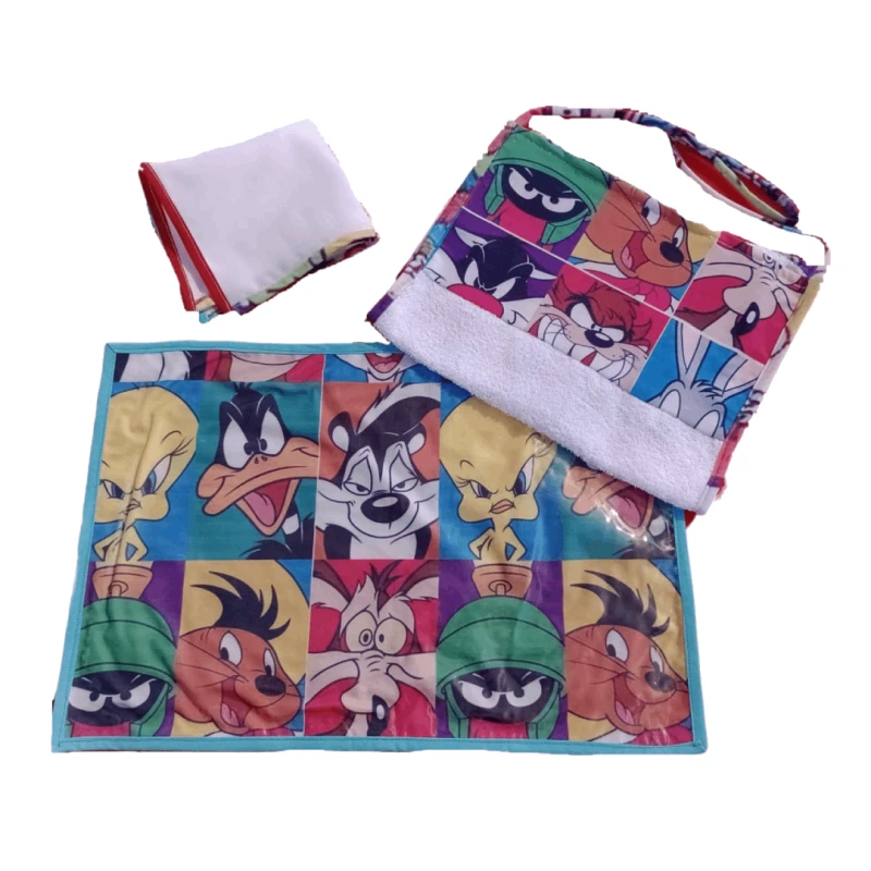 Incluye un individual sublimado, forrado con cristal para mayor durabilidad, una toalla con el mismo diseño y cuerda para colgar del cuello, y una servilleta combinada.