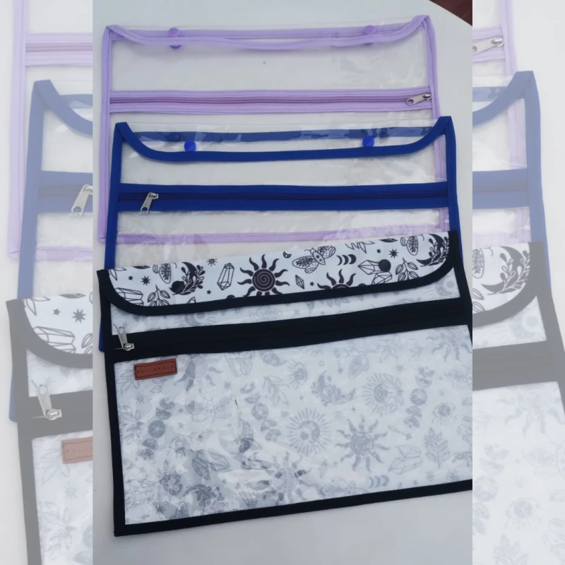 Sobre grande con broche superior y un bolsillo interno con cierre, ideal para guardar útiles, apuntes, cargadores o documentos.